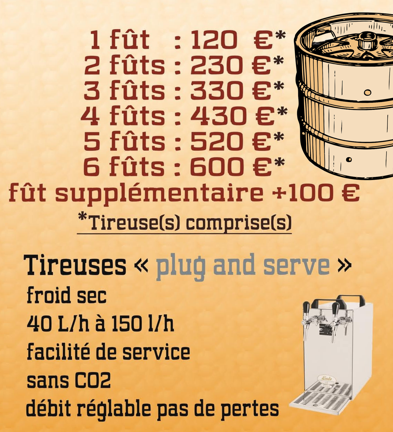La Blonde, la Dorée et la Ambrée sont en stock continu. Blanche, Zen ou bière à façon sur demande (15 fûts minimum)